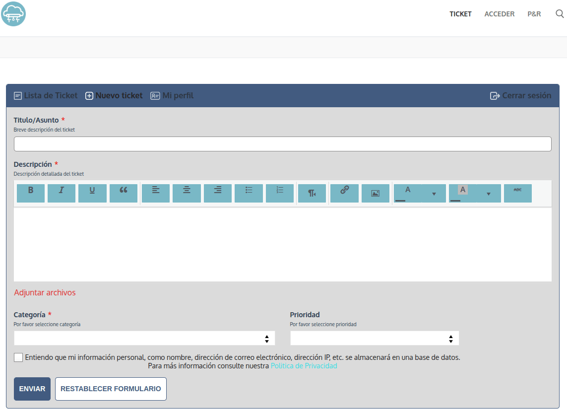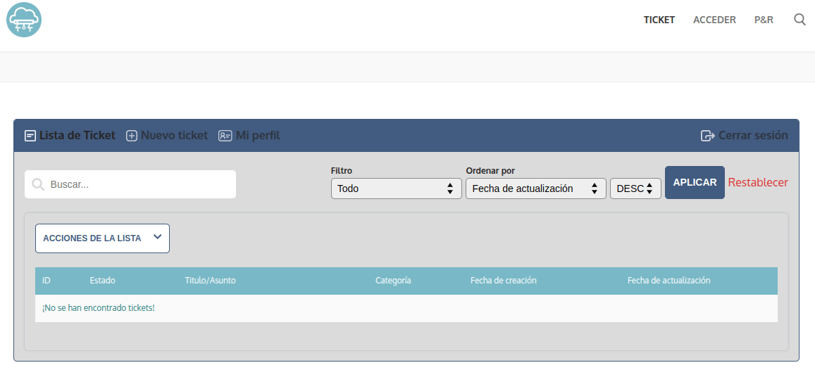 - Cuando inicie sesión podrá ver el panel para crear nuevos tickets.